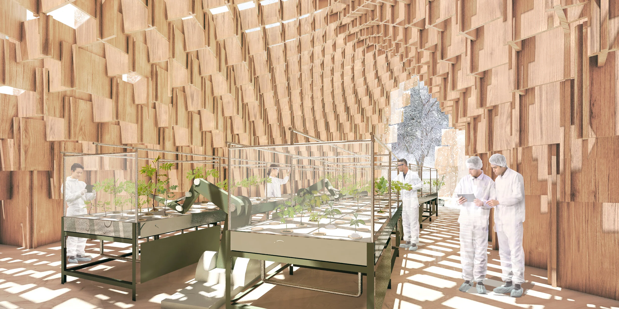 Crown shyness is a naturally adaptive phenomenon where crowns of trees do not touch each other, forming an optimized canopy with little gaps. The Living Lab is a proposal of that exact livelihood, where the boundary between forest and building co-exist through a resiliency of sharing knowledge in three dimensions: between forest and non-forest, humans and machines, and home and work. Rather than separate sites for timber processing and LVL production, the project relies on a mobile, bot-driven, automated process, for easier access to trees and replication of panels. The Lab is an open source branching system that grows on the forest floor under the deciduous canopy, intersecting with the bot grid where it forms a continuous space of Living and Laboratory spaces.